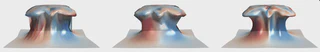 Comparison of a jetstream timesurface downsampled to 20x20 points (left), at original 300x300 points resolution (right) and after applying the particle relaxatio method to the downsampled surface (center).Abstract