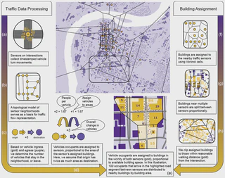 An overview of the methodology presented in this paper, guided by the data workflow. The left-hand side of the figure, (a)-(d), illustrates the traffic data workflow to determine the flow of people into and out of the area. The right-hand side of the figure, (f )-(h), illustrates the building workflow to identify the mapping from intersections to buildings, using Voronoi cells.Finally, the two workflows join at the bottom of the figure (e): the prospective building occupants for each intersection are distributed to its assigned buildings.Abstract