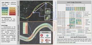 Comparison of an animated trails visualization (used at microscopic scale) and our proposed animated strips-network for visualizing lane usage at mesoscopic scale for a section of road that has a speed limit of 55 mph. Major advantages of animated strips-networks include indication of driving direction in static views, and the display of traffic density in individual lanes. A color-coded lane-usage matrix representation is developed and integrated with the animated strips-network to provide a coordinated view for visualizing detailed traffic condition in individual lanes.Abstract