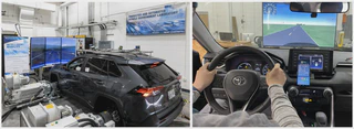 Setup for dynamometer testing (left) and view from inside the vehicle showing simulated traffic linked to the driver, and a mobile app showing speed recommendations (right).Abstract